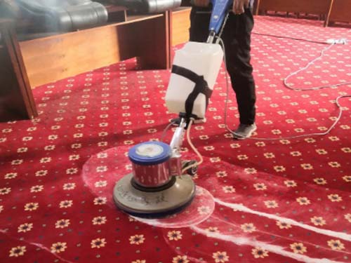 清洁液均匀地喷洒在地毯上,用刷子刷洗地毯表面,用吸水机或湿洗机抽取水分。